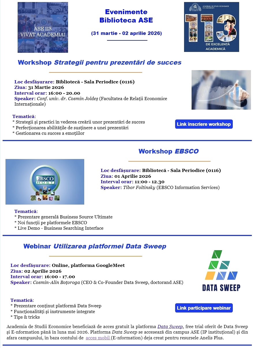 Evenimente Biblioteca ASE (31 martie – 02 aprilie 2026) – detalii și înscriere aici.